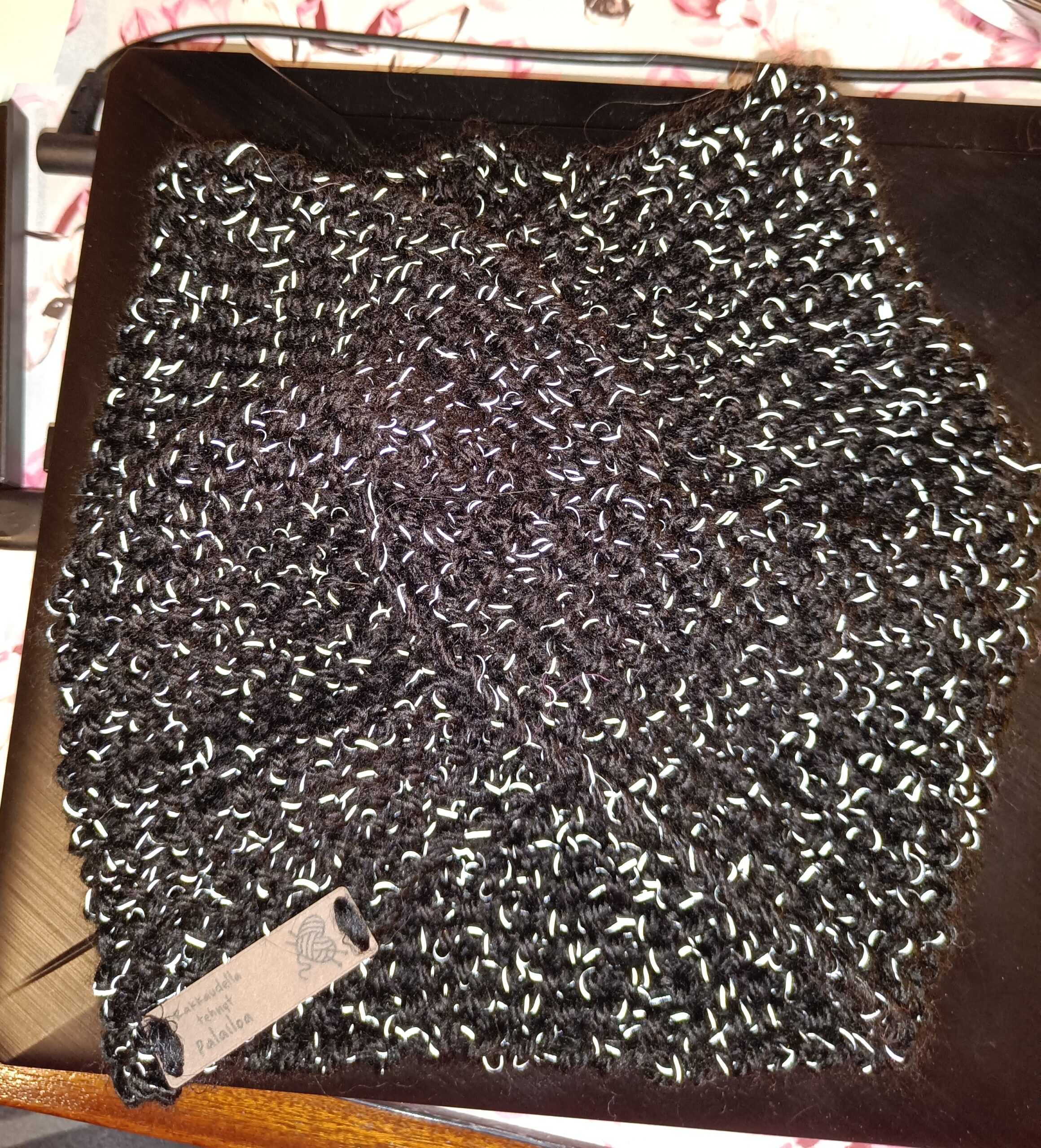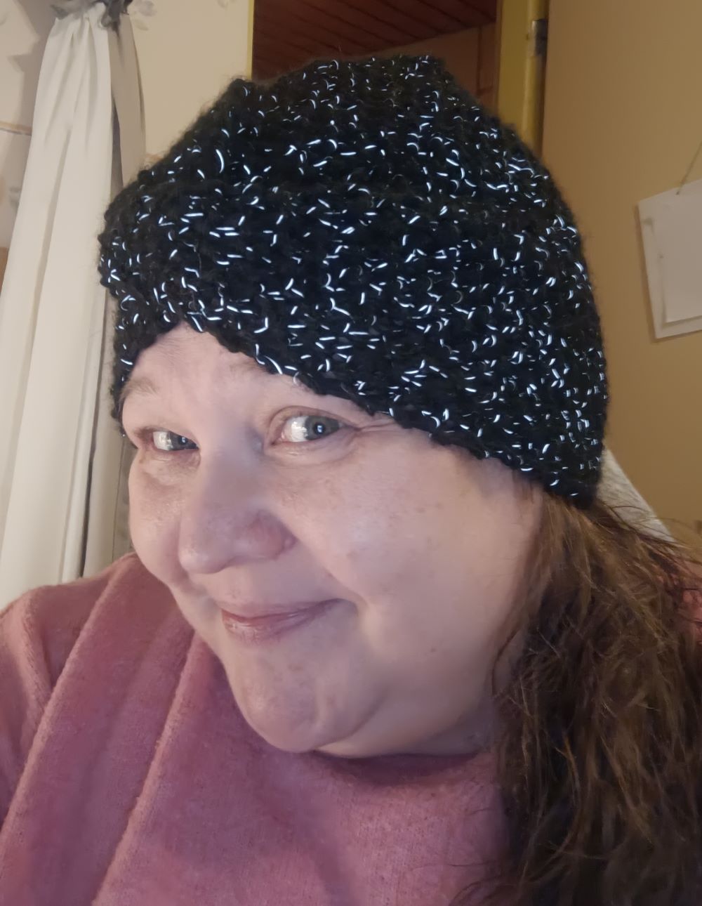 Pehmeästä heijastinlangasta neulottu leveä rusettipanta aikuiselle. Venyttämättä ympärysmitta 47 cm. Leveys 23 cm. Peittää hyvin korvat ja poskiakin kylmältä viimalta. Saat kuitenkin kätevästi esimerkiksi ponihännän pannan läpi.