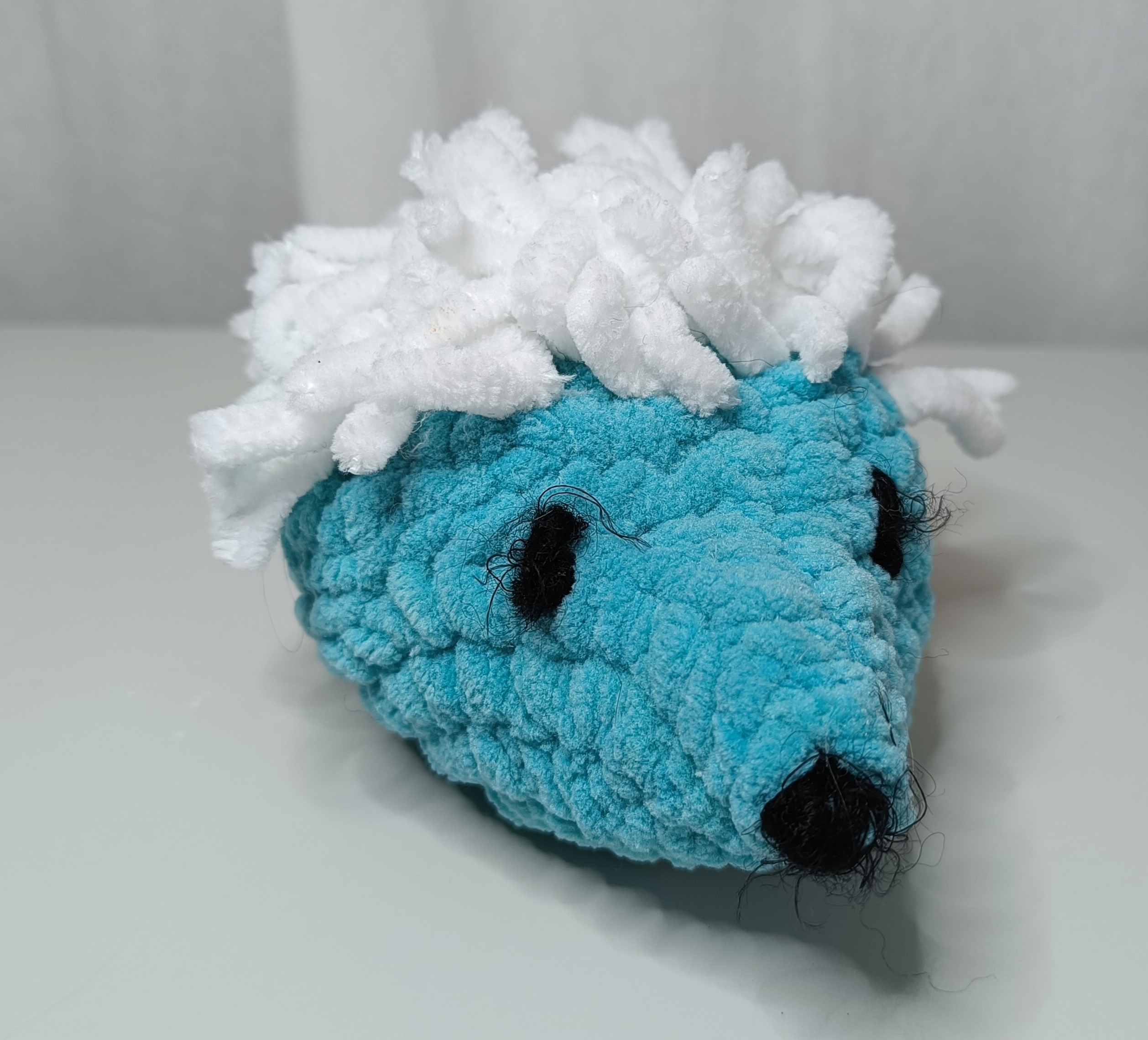 Turkoosilla siilillä on valkoiset piikit, jotka ovat kylläkin myös pehmeät. Tämän kamun kanssa voi pienempikin uinuja ottaa turvallisesti vaikka päikkärit, sillä silmät ja kuono on ommeltu langalla.