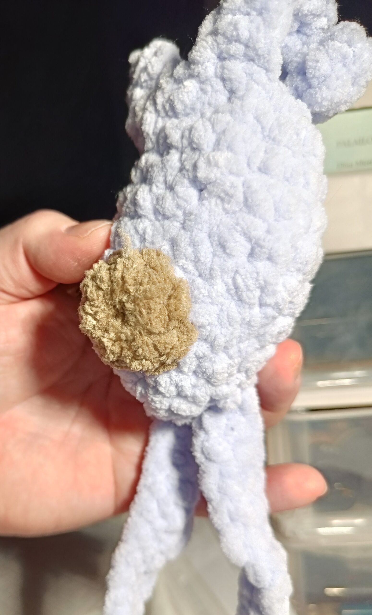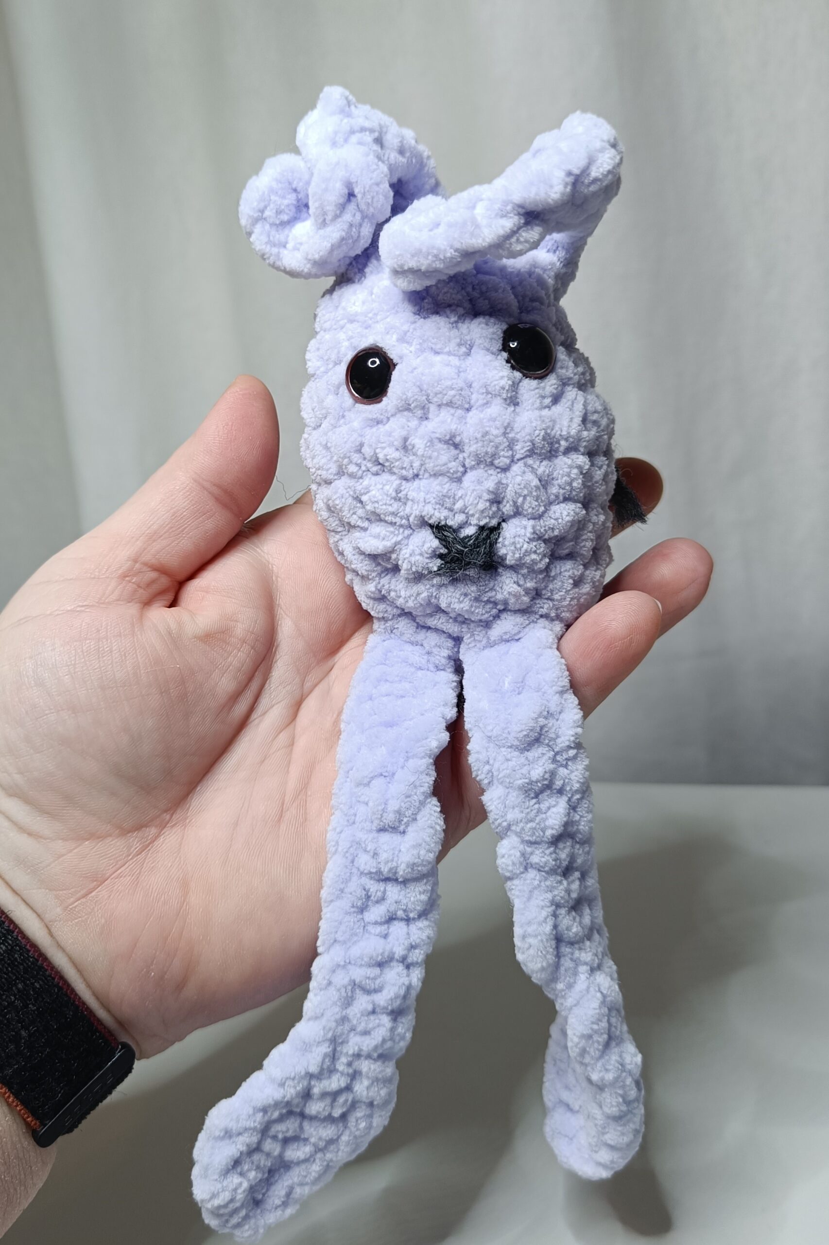 Tämä veikeä pehmopupunen on mukava, koska sillä on pitkät, lötköt jalat ja kippurat korvat, joita on kiva silitellä. Myös söpö pupunhäntä löytyy. Pupulla on turvasilmät, mutta muistathan, ettet anna alle 3-vuotiaan leikkiä lelulla ilman valvontaa. Pupun pituus on n. 27 cm. Lelu on virkattu polyesterilangasta ja täytetty pestävällä polyesteritäytteellä.
