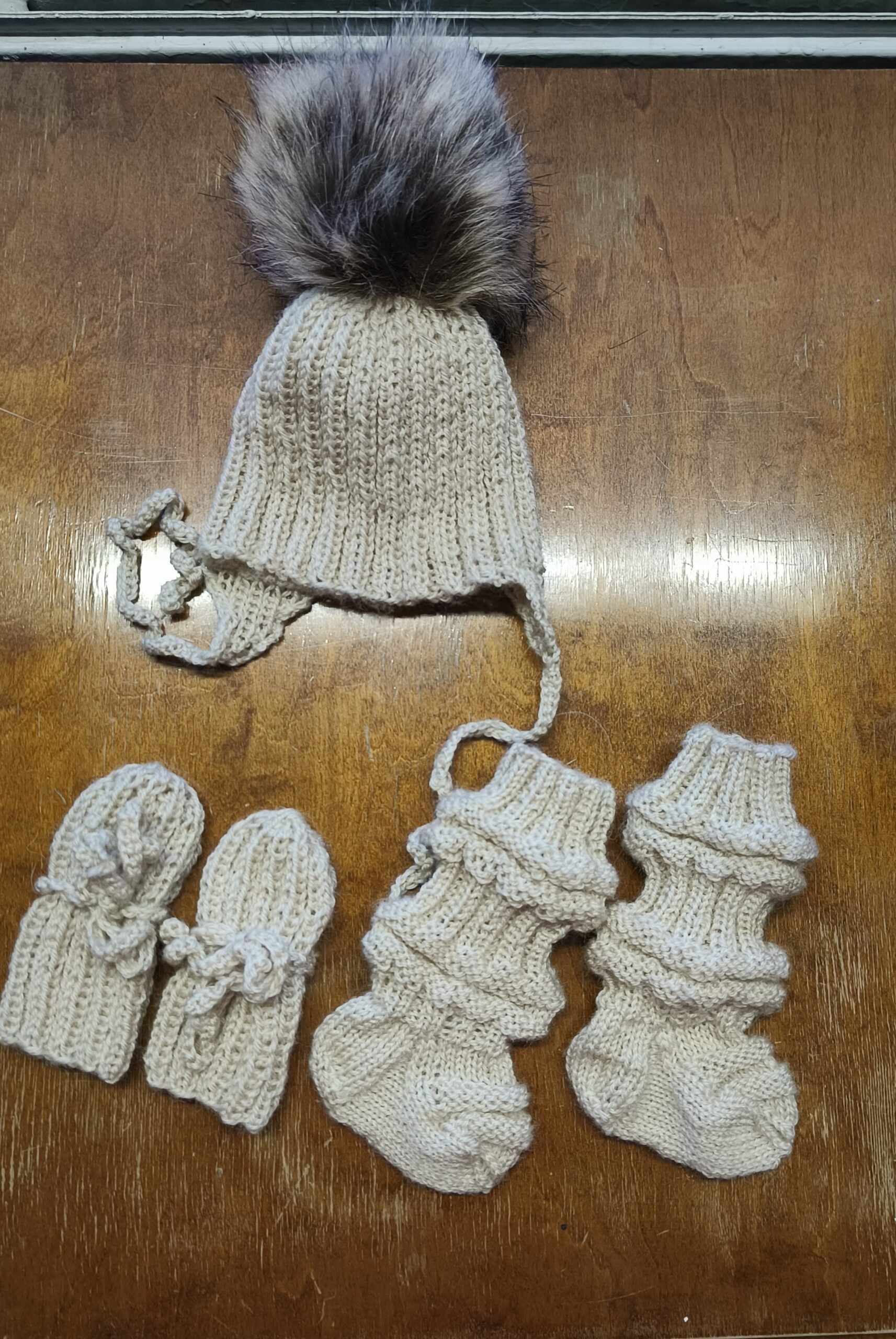 | väri koko | vihreä pipo tumput 6 kk, valkoinen pipo sukat 6 kk, beige pipo tumput 3 kk |