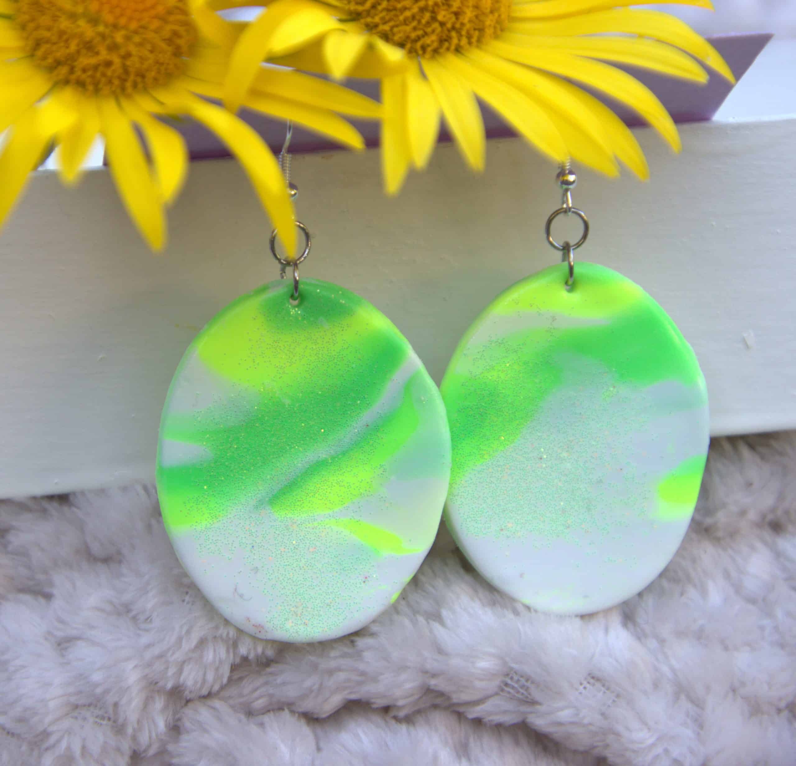 Soikean muotoiset neonväriset ja hieman kimmeltävät fimo-massasta tehdyt korvikset. Korvakorujen pidempi mitta on noin 5 cm. Korut eivät sisällä nikkeliä, kadmiumia tai lyijyä.