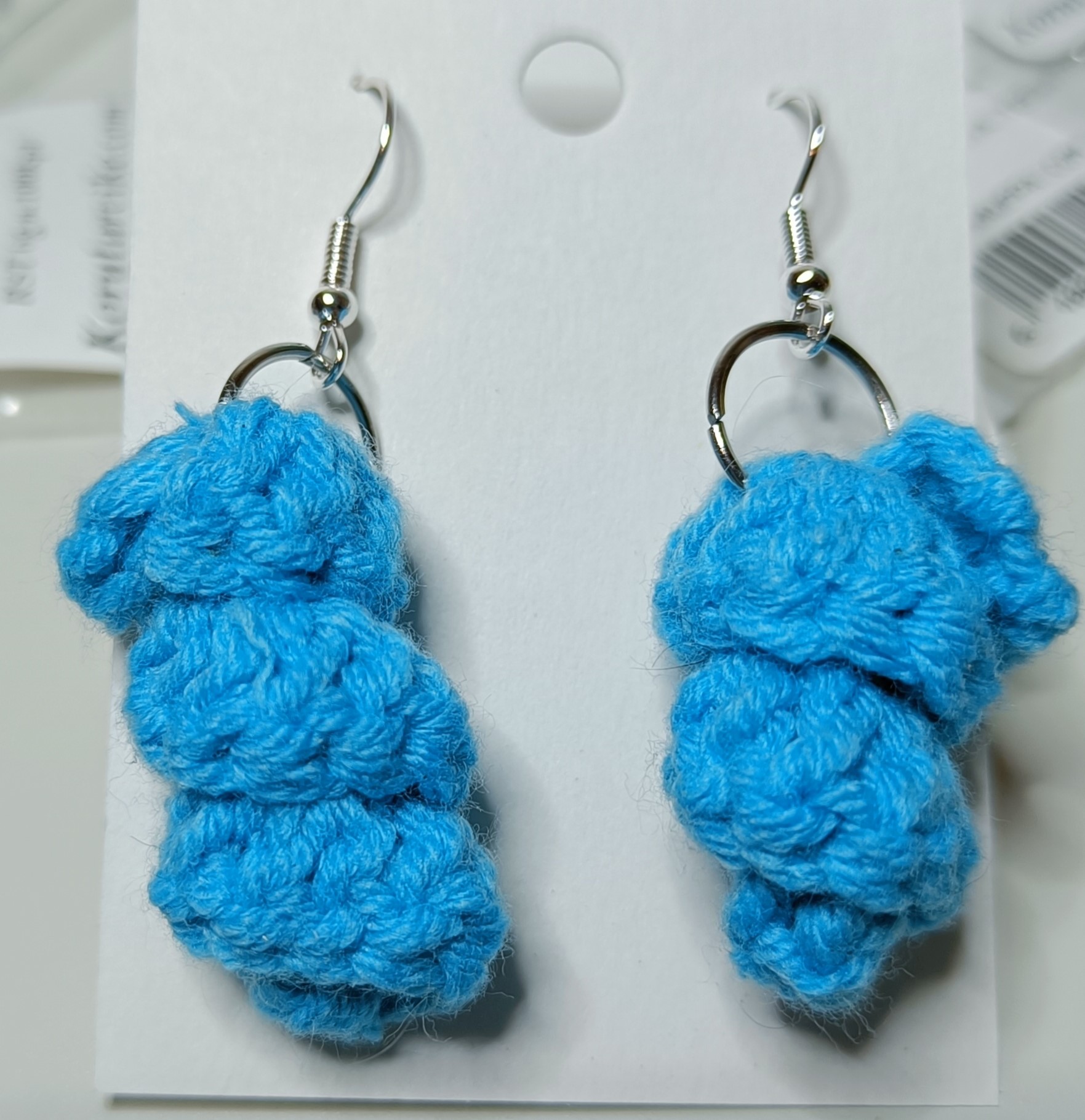 Värikkäät puuvillalangasta virkatut ”mato”korvakorut. Koruosat eivät sisällä nikkeliä, kadmiumia tai lyijyä. Silikonitaustat.