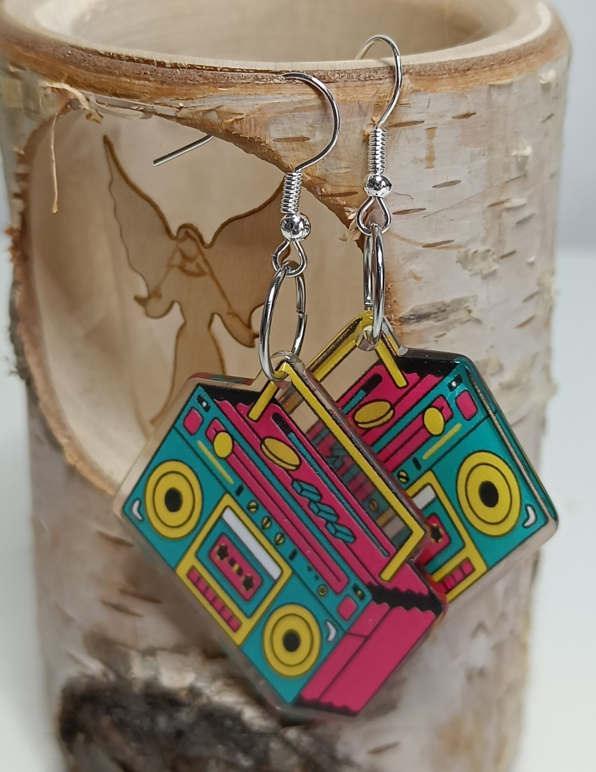 Useita erilaisia yksilöllisiä, retroaiheisia korvakoruja. Koruosat eivät sisällä nikkeliä, lyijyä tai kadmiumia. Silikonitaustat.