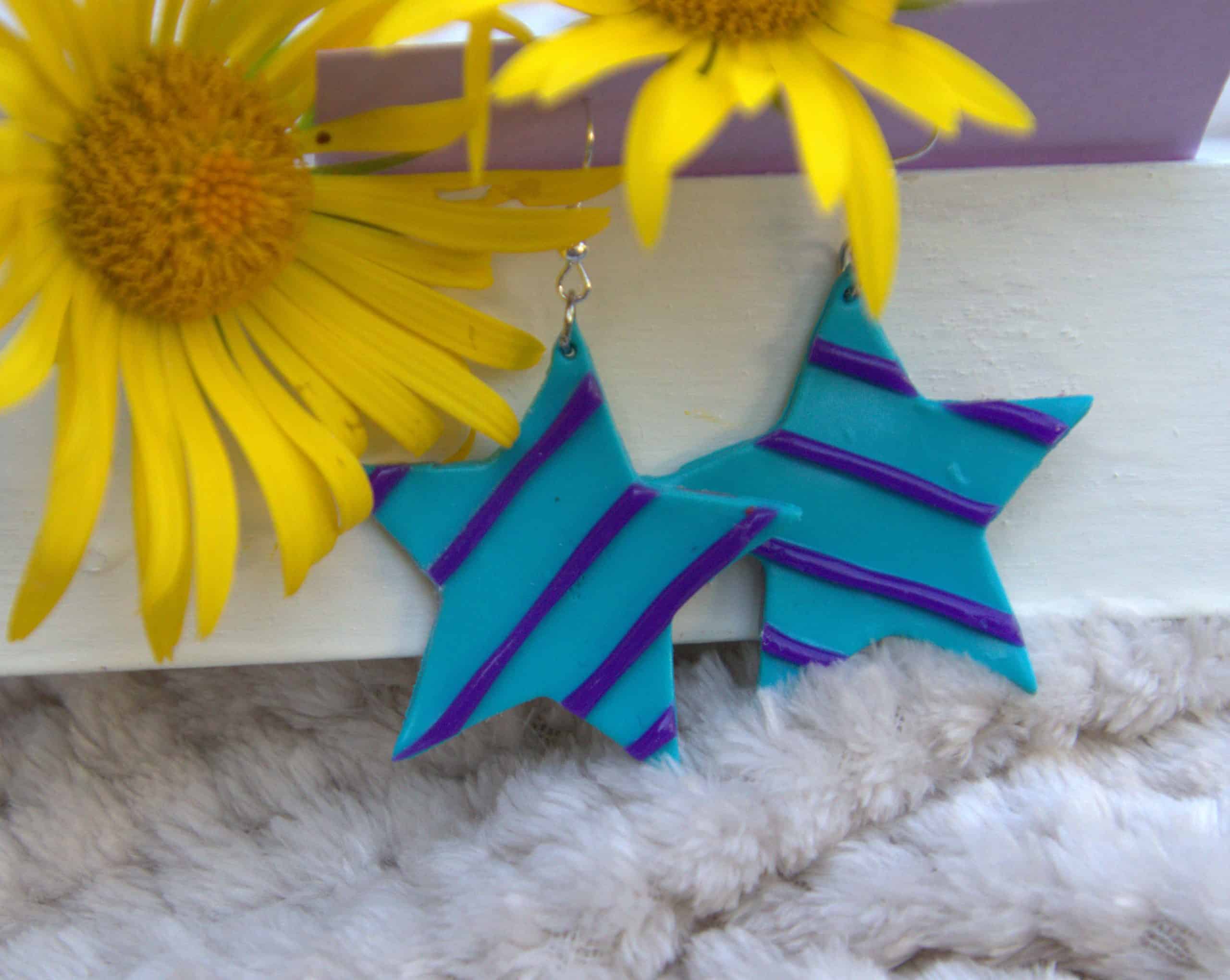 Fimomassasta tehdyt tähtikorvikset. Silikonitaustat. Koruissa ei ole nikkeliä, lyijyä tai kadmiumia.